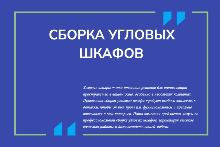 Угловые шкафы – это отличное решение для оптимизации пространства в вашем доме, особенно в небольших комнатах. Правильная сборка углового шкафа требует особого внимания к деталям, чтобы он был прочным, функциональным и идеально вписывался в ваш интерьер. Наша компания предлагает услуги по профессиональной сборке угловых шкафов, гарантируя высокое качество работы и долговечность вашей мебели.